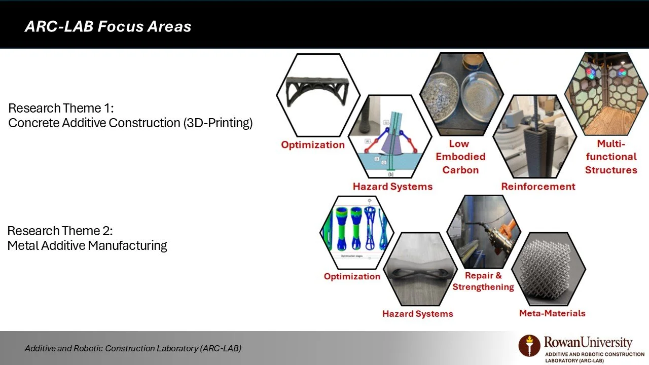 The focus areas of the Additive and Robotic Construction Laboratory (ARC-Lab) at Rowan University, divided into two main research themes: Concrete Additive Construction (3D-Printing) and Metal Additive Manufacturing. Under Concrete Additive Construction, key areas of exploration include optimization, hazard systems, low embodied carbon, reinforcement, and multi-functional structures. These areas aim to improve the efficiency, sustainability, and versatility of 3D-printed concrete applications. For Metal Additive Manufacturing, the lab focuses on optimization, hazard systems, repair and strengthening, and the development of meta-materials to enhance structural performance and durability. Together, these research themes illustrate ARC-Lab’s commitment to advancing construction technology through innovative additive manufacturing techniques.